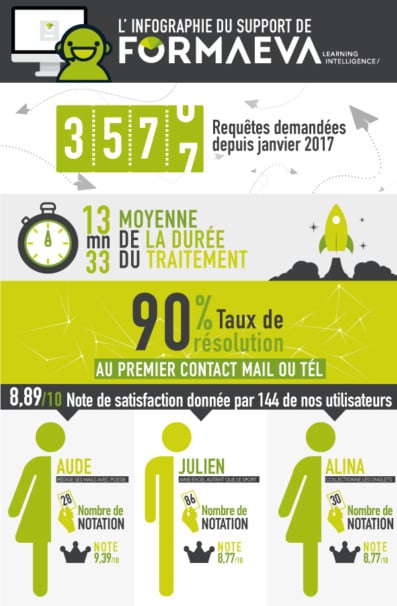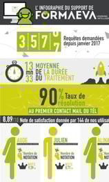 Cette infographie est un parfait exemple d'une de mes créations pour Formaeva à destination de ses clients. En reprenant les couleurs de la charte graphique, nous avons voulu exprimer le dynamisme de l'équipe de support ainsi que les statistiques annuelles positives concernant les contacts clients.